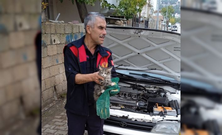 Aracın motor kısmına sıkışan kedi kurtarıldı