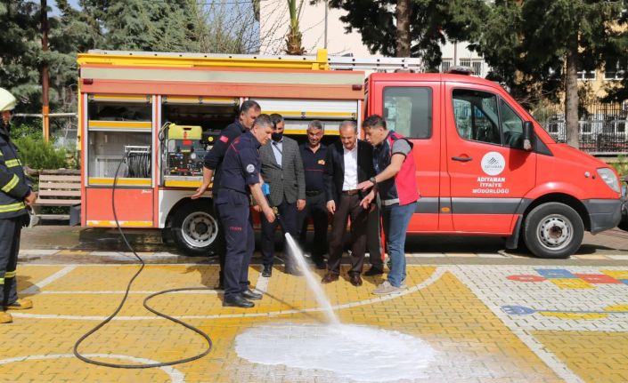 Nene Hatun Anaokulunu ziyaret eden Adıyaman Belediye Başkanı Süleyman Kılınç, burada itfaiyecilik ve yangından korunma konularında eğitim veren Adıyaman Belediyesi İtfaiye Müdürlüğü ekiplerinin verdiği eğitimlere katılarak, minik öğrencilerle birlikte yangından korunma yöntemleri hakkında bilgi aldı.