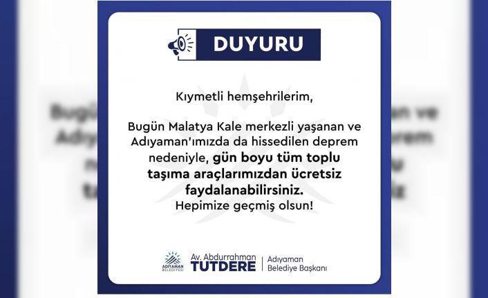Malatya’da meydana gelen 5.9 şiddetindeki deprem sonrası Adıyaman’da belediye yolcu otobüsleri 1 günlük ücretsiz hizmet verecek.