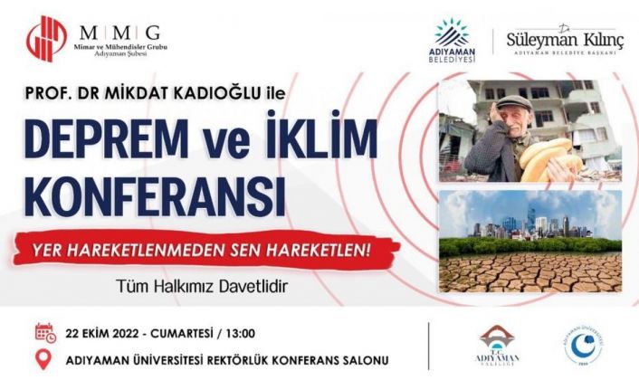 İstanbul Teknik Üniversitesi (İTÜ) Afet Yönetim Merkezi ve Meteoroloji Mühendisliği Bölümü Öğretim Üyesi Prof. Dr. Mikdat Kadıoğlu, Adıyaman Belediyesi, Adıyaman Üniversitesi ve Mimar ve Mühendisler Grubu (MMG) Adıyaman Şubesi tarafından ’Yer hareketlenmeden sen hareketlen’ sloganıyla gerçekleştirilecek olan ’Deprem ve iklim konferansında’ bilgilendirmelerde bulunacak.