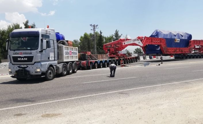 Şanlıurfa’da imal edilen ve yurt dışına götürmek için İskenderun Limanına doğru yola çıkan dev trafoyu taşımak günler sürüyor. Dev trafoyu taşıyan araç Adıyaman’dan geçti.