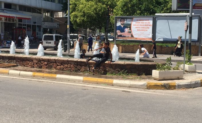 Adıyaman’da havaların ısınmasıyla birlikte sokakta oynayan çocuklar süs havuzlarında serinledi.