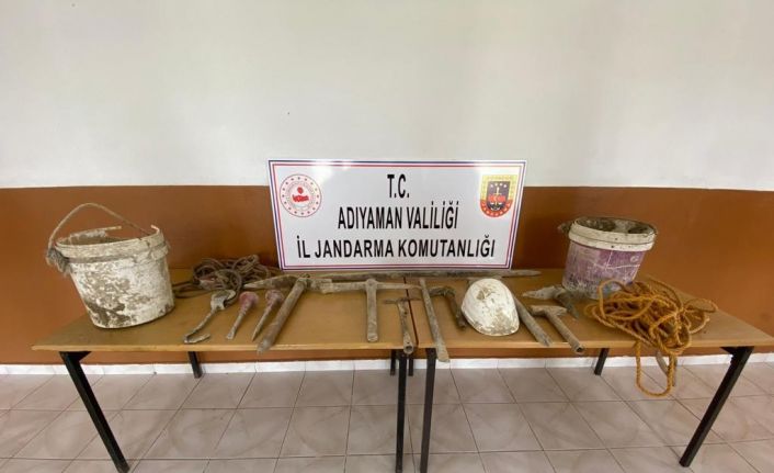 Edinilen bilgilere göre, Adıyaman’ın Tut ilçesine bağlı Yaylımlı Köyünde izinsiz kazı yapan şahısların ihbarını alan jandarma ekipleri kısa sürede harekete geçerek belirtilen bölgeye gitti. Burada kazı yapan M.A., ile A.A., isimli 2 şahsı yakalayarak gözaltına aldı. Jandarma ekipleri aynı zamanda kazı esnasında kullanılan 4 adet kazma, 2 adet demir murç, 1 adet çekiç, 1 adet manivela, 1 adet keser, 1 adet baret, 1 adet tahra, 1 adet kancalı makara, 4 adet kova, 5 metre tahta merdiven, 20 metre halatta ise el koydu.
