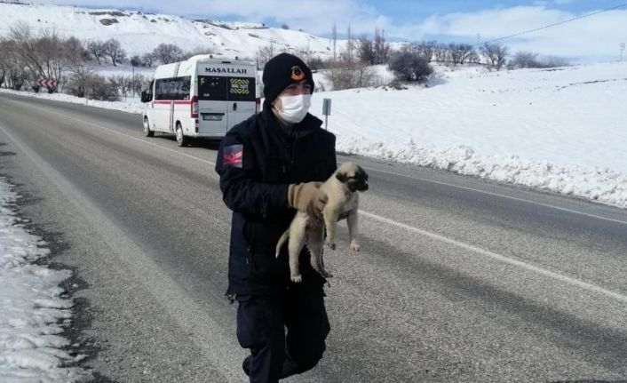 Adıyaman’ın Kahta ilçe Jandarma Karakol Komutanlığı ekipleri tarafından yol kenarında soğuktan bitkin halde bulunan yavru köpek, veteriner müdürlüğüne teslim edildi.