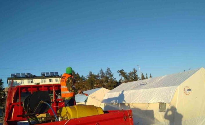 Kahta Belediyesi iki büyük depremin ardından Toprak Mahsulleri Ofisi bahçesinde ve Yavuz Selim Mahallesi’nde kurulan çadır kentte ilaçlama ve dezenfeksiyon çalışmalarına devam ediyor.
