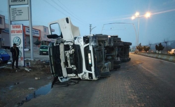 Adıyaman’ın Gölbaşı ilçesinde Sanayi Sitesi Kavşağı’nda sürücüsünün kontrolünden çıkan Tır yan yattı.