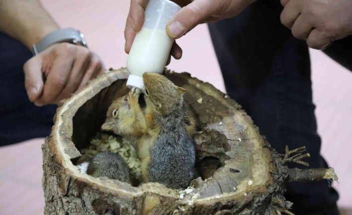 Kütükten çıkan 3 sincap yavrusu biberonla besleniyor