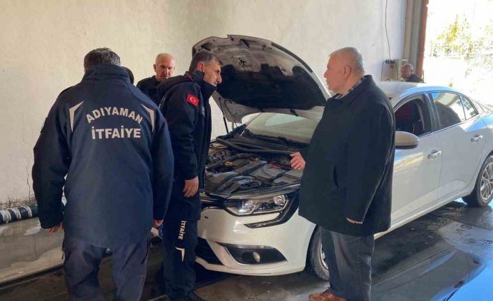 Adıyaman’da bir otomobilin motor kısmına sıkışan kedi, itfaiye ekiplerince çıkarıldı.