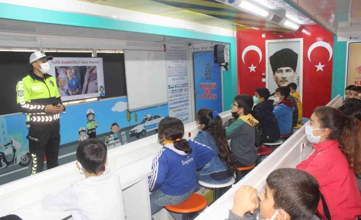 Teorik ve uygulamalı trafik eğitiminin verilmesini sağlamak amacıyla İçişleri Bakanlığınca Adıyaman’a getirilen mobil eğitim tırında öğrencilere eğitim verildi.