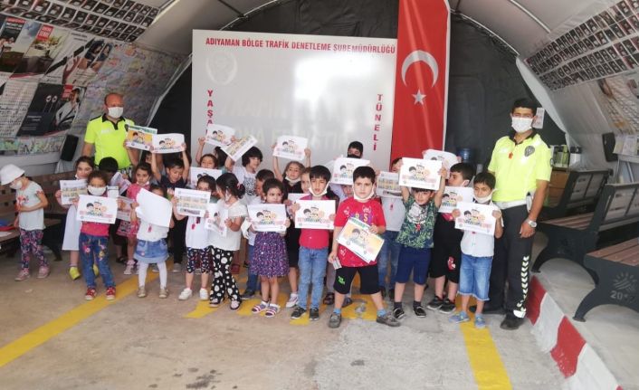 Adıyaman’da anaokulu öğrencileri Emniyet Müdürlüğünün uygulama noktasında bulunan yaşam tüneli çadırına girdi.