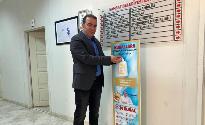 Samsat Belediye Başkanlığınca ilçedeki bütün kamu kurum ve kuruluşları ile halkın yoğun olduğu yerlerine dezenfekte noktaları kurularak, vatandaşların giriş çıkışlarda ellerini dezenfekte etmeleri ve bilgilenmeleri sağlandı.