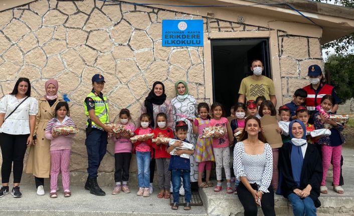 Adıyaman’ın Kahta ilçesinin Erikdere Köyü okulunda öğrencilerle bir araya gelen Adıyamanlı Şehit Jandarma Uzman Çavuş Ayhan Yanık’ın eşi Beyhan Yanık, Adıyamanlı Nazlıcan Uçar, Seval İlhan ve Nuray Şahin, kırtasiye ve oyuncak yardımında bulundu. Köy okulu öğrencileriyle bir araya gelen gençlere, Kahta ilçe Jandarma Komutanlığı ekipleri de eşlik etti.