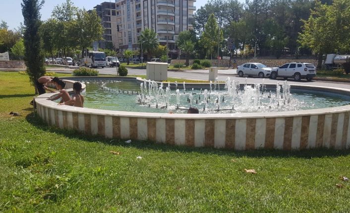 Adıyaman’da, sıcaktan bunalan yaşı küçük çocuklar süs havuzlarında serinlemeye çalışıyor.