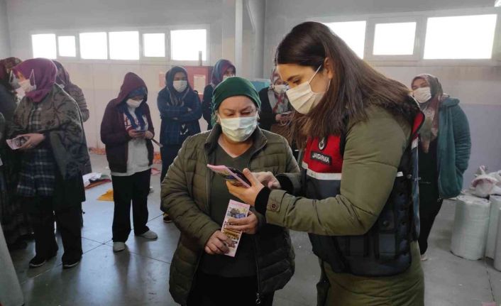 Adıyaman İl Jandarma Komutanlığı ekipleri tekstil fabrikasında çalışan kadınlara KADES uygulamasını anlattı.