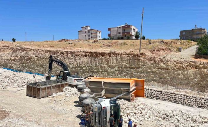 Adıyaman’ın Besni ilçesinde yük boşaltma sırasında kontrolden çıkan kamyon devrildi.