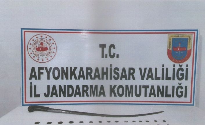 Afyonkarahisar’da jandarma ekipleri düzenlediği operasyonda tarih eser niteliği taşıyan kılıç, çeşitli objelerle birlikte 85 adet sikke ele geçirdi.