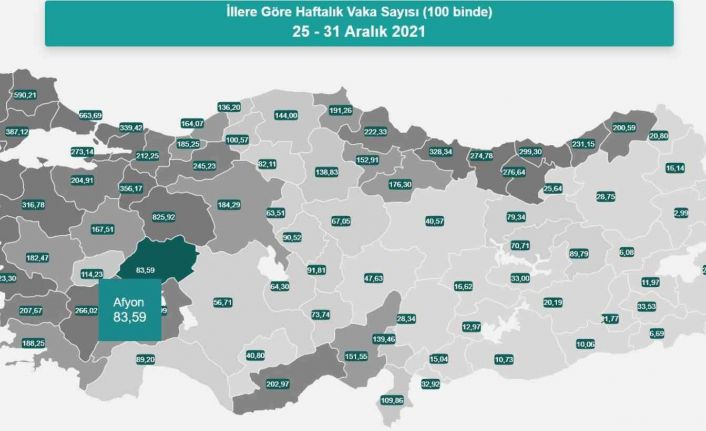 Sağlık Bakanı Fahrettin Koca, 100 bin nüfusa karşılık gelen haftalık korona virüs (Covit-19) vaka haritasını açıkladı. Açıklamaya göre, 25-31 Aralık tarihleri arasında Afyonkarahisar’da yüz bin nüfusu gelen vaka sayısı yüzde 83,59 çıkarak yaklaşık 600 kişiye yükseldiği belirtildi.