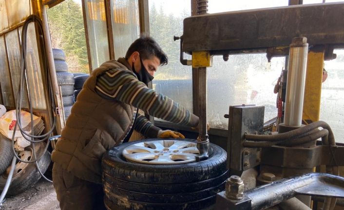 Kentte dün başlayan kar yağışı yüksek kesimlerde etkisini sürdürürken, sürücüler de kendilerini uzun sürecek olan kışa hazırlıyor. Özellikle kış lastiği taktırması zorunlu olan araç sürücüleri lastikçilere akın etti. Yağan karla birlikte işlerin bir anda açıldığını belirten lastik tamircisi Ahmet Zeybek, kar yağışı ile birlikte işlerinin de arttığını, bu nedenle yoğunluk yaşadıklarını söyledi. Kış lastiklerinin kış yüzünü göstermeden takılması gerektiğini ve son güne bırakılmaması gerektiğinin altınız çizen Zeybek: “