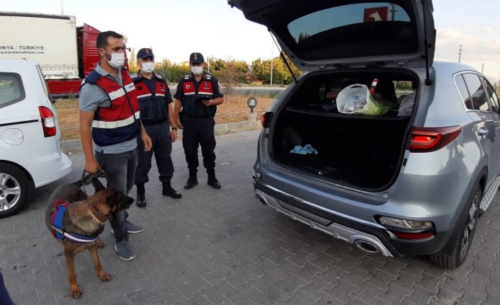 Afyonkarahisar’ın Bolvadin ilçesinde jandarma tarafından asayiş ve trafik denetimi gerçekleştirilirken, denetimlerde eğitimli narkotik köpekleri de kullanıldı.