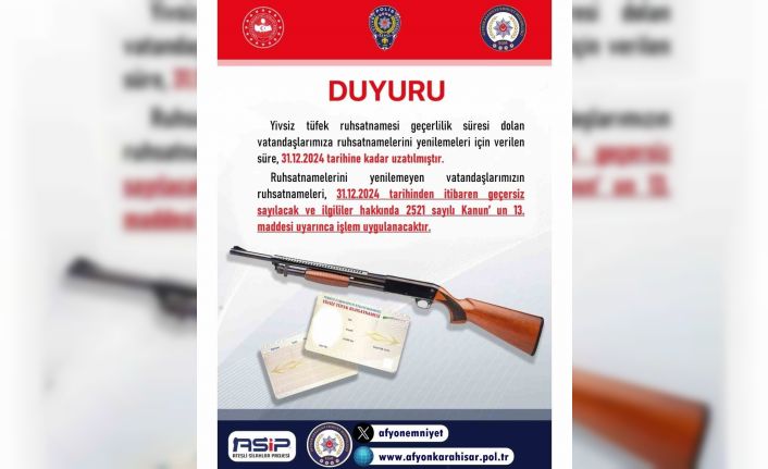 Afyonkarahisar İl Emniyet Müdürlüğünden yapılan açıklamada yivsiz tüfekleri bulunan vatandaşların ruhsatlarını yenilemeleri gerektiği konusunda uyarıda bulunuldu.
