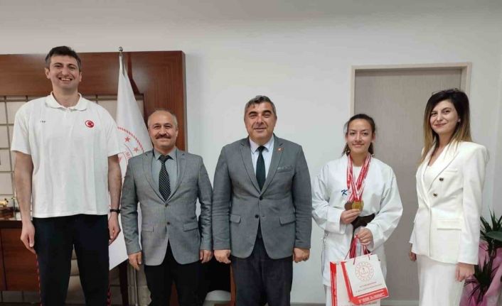 Okul Sporları Karate Kumite 66 kilogram A Genç Kız kategorisinde bölge üçüncüsü olarak başarı gösteren ve 6 Haziranda düzenlenecek olan Türkiye finallerine katılmaya hak kazanan Işıklar Çok Programlı Anadolu Lisesi 11. sınıf öğrencisi Nurbeyaz Akçin İl Milli Eğitim Müdürü Miraç Sünnetci’yi makamında ziyaret etti.