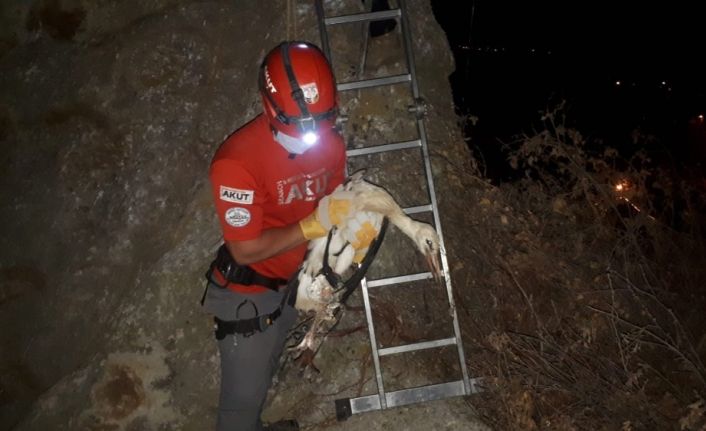 Afyonkarahisar’da ayağına dolanan kablo ile kayalıklarda mahsur kalan leylek AKUT ekipleri tarafından kurtarıldı.