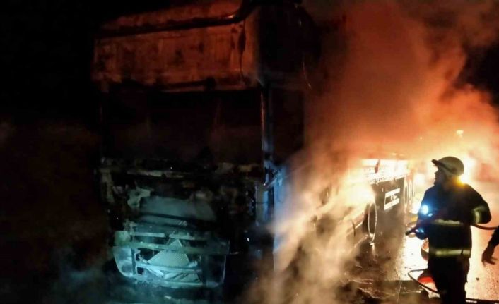 Afyonkarahisar’da seyir halindeki tırın tekerlek balatalarında çıkan yangın kısa sürede aracı sararak kullanılamaz hale getirdi.