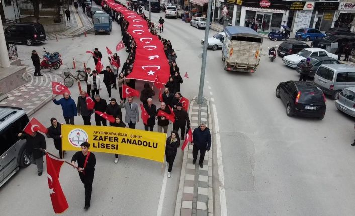 Afyonkarahisar’ın Şuhut ilçesinde Zafer Anadolu Lisesi öğrencileri son dönemde Türk bayrağına yönelik yapılan saygısızlıklara tepki göstermek ve milli değerlere sahip çıkmak amacıyla anlamlı bir etkinliğe imza atarak, yaklaşık 100 metre uzunluğundaki Türk bayrağıyla yürüyüş yaptılar.
