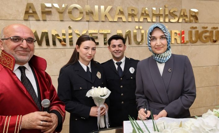 Afyonkarahisar İl Emniyet Müdürlüğü’nde görevli polis memurları Furkan Arslan ve Kübra Nur Karadoğan, unutulmaz bir nikah töreniyle dünyaevine girdi. Emniyet Müdürlüğü binasında düzenlenen törene, mesai arkadaşlarının yanı sıra il protokolü de katıldı.