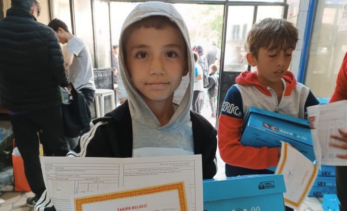 Afyonkarahisar’da hayırsever bir iş insanı takdir belgesini getiren öğrencilere ayakkabı hediye etti.