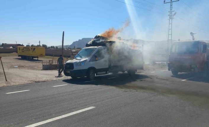 Ağrı’da saman yüklü bir kamyonet içerisinde bulunan samanlar küle döndü.