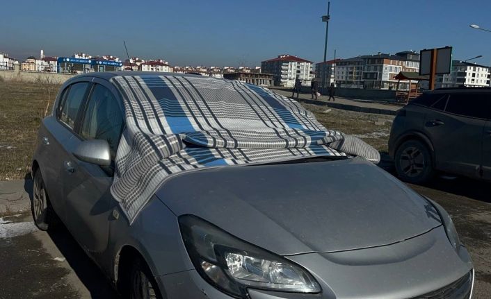 Yeniden soğuk havanın etkisi altına giren Ağrı’da, vatandaşlar araçlarını soğuktan korumak için battaniye ile örttü.