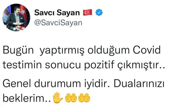 Ağrı Belediye Başkanı Savcı Sayan, rahatsızlığı sebebi ile yaptırmış olduğu Koronavirüs test sonucunun pozitif çıktığını açıkladı. Sosyal medya hesabından konuya ilişkin detayları duyuran Başkan Sayan, “Bugün yaptırmış olduğum Covid testimin sonucu pozitif çıkmıştır. Genel