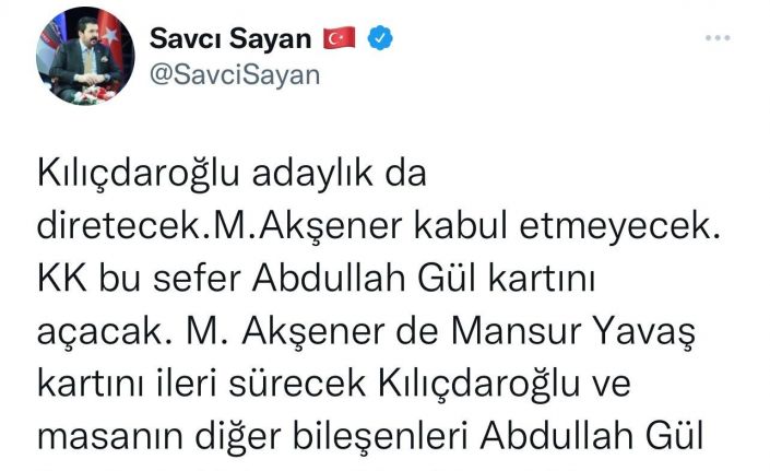 “Kılıçdaroğlu adaylık da diretecek. Meral Akşener kabul etmeyecek. Kemal Kılıçdaroğlu bu sefer Abdullah Gül kartını açacak. Meral Akşener’de, Mansur Yavaş kartını ileri sürecek Kılıçdaroğlu ve masanın diğer bileşenleri Abdullah Gül üzerinde uzlaşacaklar Meral Akşener ya kabul edecek ya da masayı devirecek”