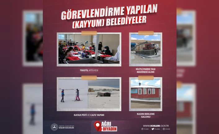 Belediyeye kayyum atandıktan sonra, Diyadin Belediye Başkanlığı’nca ilçeye kazandırılan Tekstil Atölyesi, Kilitli Parke Taşı Üretim Fabrikası, Kayak Pisti ve Kafe ile Kadın Bekleme Salonu gibi projeler, ilçeye önemli katkı sağlarken, 60 kilometre stabilize yol, 18 kilometre içme suyu şebeke hattı, 20 bin metrekare kilitli parke yapımı, 3 kilometre içme suyu isale hattı, 3 kilometre kanalizasyon hattı, 1,2 kilometre dere ıslahı, 1 adet spor tesisi, 10 adet sosyal etkinlik alanı yapımı ve kentin güzel ve yeşil olması için 2 bin 200 adet fidan dikimi gerçekleştirildi.