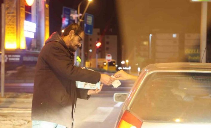 Aksaray’da elindeki mendil kutusuyla karayollarındaki ışıklı kavşaklara çıkarak satış yapan 42 yaşındaki adam, gece boyunca sürücü ve yolculara mendil satarak kazanç sağlamaya çalışıyor.