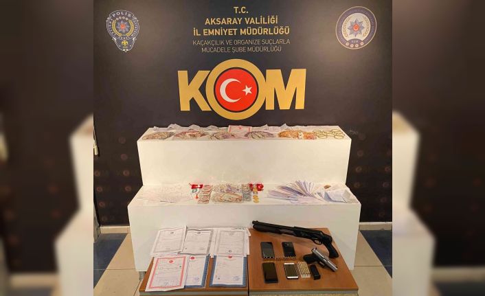 Edinilen bilgiye göre, tefecilik ve suçtan elde edilen gelirlerin önlenmesi amacıyla çalışma yapan İl Emniyet Müdürlüğü Kaçakçılık ve Organize Suçlarla Mücadele (KOM) Şubesi ekipleri tespit ettikleri 4 şüpheli üzerinde takip başlattı. Bir süre yapılan teknik ve fiziksel takibin ardından operasyon için düğmeye basan KOM ekipleri Aksaray merkezli Kayseri ilinde baskınlar yaptı. 2 ilde eş zamanlı olarak gerçekleştirilen operasyonda 4 şüphelinin işyeri ve ikametlerinde yapılan aramada, 821 bin 250 TL, 179 bin Sterlin ve 6 bin Euro bedelli 52 adet senet, 434 bin 754 TL değerinde ziynet eşyası, çok sayıda tapu ve doküman, 8 bin 320 Sterlin, 3 bin 80 Euro, 2 bin 155 ABD Doları ile 1 adet ruhsatsız av tüfeği, 1 adet kurusıkı tabanca, çok sayıda fişek ile kartuş ele geçirildi. Operasyonda gözaltına alınan 4 şüpheliden M.Y. (52) isimli şahıs tutuklanarak cezaevine gönderilirken 3 şüpheli adli kontrol şartı ile serbest bırakıldı.