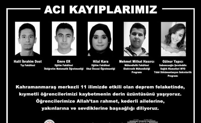 Açıklamada, “Kahramanmaraş merkezli 11 ilimizde etkili olan deprem felaketinde kıymetli öğrencilerimizi kaybetmenin derin üzüntüsünü yaşıyoruz. Öğrencilerimize Allah’tan rahmet, kederli ailelerine, yakınlarına ve sevdiklerine başsağlığı diliyoruz” ifadelerine yer verildi.