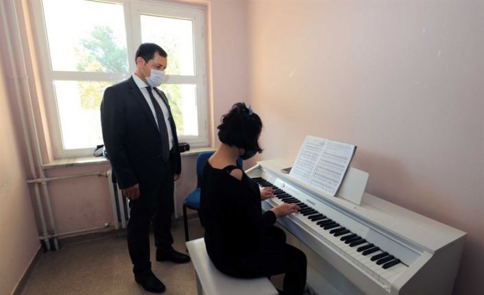 İncelemeye Amasya Güzel Sanatlar Lisesi ile başlayan Vali Mustafa Masatlı, korona virüs ile mücadele kapsamında maske, mesafe ve hijyen kuralları başta olmak üzere alınan tüm tedbirleri yerinde göndü. Güzel Sanatlar Lisesi’nde sınıfları ziyaret eden Vali Masatlı, öğrencilerle sohbet ederek maske, sosyal mesafe ve el hijyenine her zamankinden daha çok dikkat etmeleri gerektiğini de hatırlattı. Müzik atölyelerini de ziyaret eden Vali Masatlı’ya öğrenciler bir müzik dinletisi icra etti.