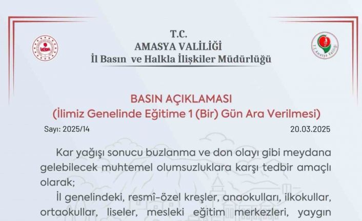 Amasya’da kar yağışı sonucu buzlanma ve don olayı gibi meydana gelebilecek olumsuzluklara karşı tedbir amaçlı olarak 21 Mart Cuma günü il genelinde eğitime 1 gün ara verildi.