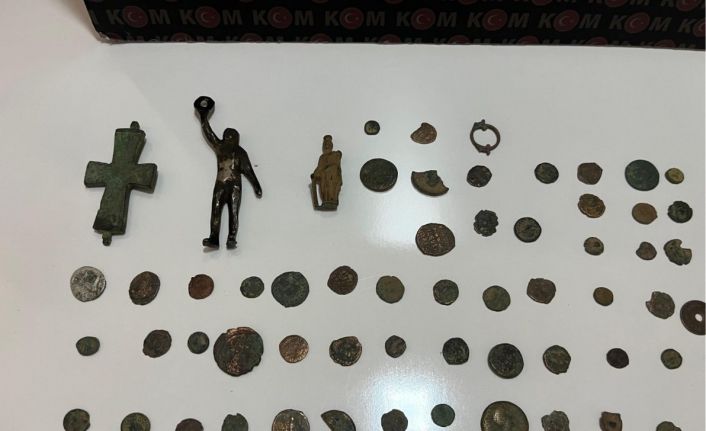 Amasya’da düzenlenen operasyonda 77 sikke, Roma dönemine ait olduğu değerlendirilen 2 bronz heykel, ?1 haç figürü ve 1 küpe ele geçirildi.
