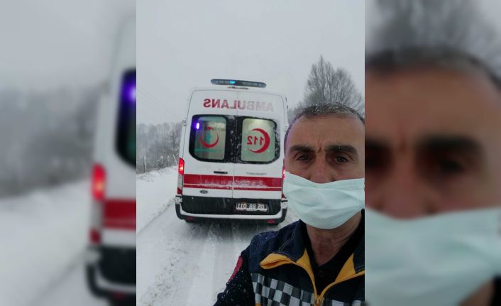 Taşova’da alçak kesimlerde yağmur, yüksek kesimlerde kar yağışı etkili oluyor. İlçeye bağlı Şeyhli köyüne hasta için giden bir ambulans akşam 17.00 sıralarında köyden dönerken 15 santimetreyi bulan kar ve tipiden dolayı yolda kaldı. Bakırpınar (Cırıklar) mezrası 1200 rakımlı Duayeri mevkisinde yoğun tipi yağışı ve sıfırın altında 2 derece sıcaklıkta mahsur kalan ambulans, mezradan gelen bir traktör yardımıyla kurtarılarak yoluna devam etti.Ambulans karda mahsur kaldı