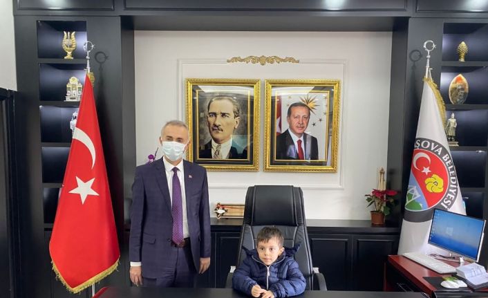 Taşova Belediye Başkanı Bayram Öztürk, kendisine geçmiş olsun ziyaretinde bulunan minik Deniz’i makam koltuğuna oturttu.
