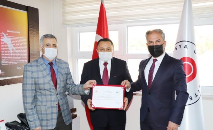 Rektör Yardımcısı Prof. Dr. Recep Kürkçü ile Sıfır Atık Komisyon Başkanı Çetin Alpaslan, Taşova Yüksel Akın Meslek Yüksekokulu Müdürü Doç. Dr. Murat Kurt’a Temel Seviye Sıfır Atık Yetki Belgesini teslim etti.