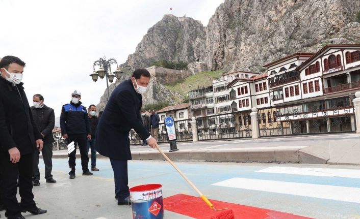 Amasya Valisi Mustafa Masatlı, yaya önceliğine dikkat çekilmesi amacıyla gerçekleştirilen etkinlikte yaya geçidinin bir şeridini eline aldığı fırçayla kırmızı renge boyadı.