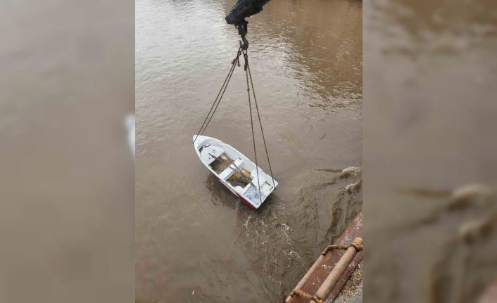 Amasya’da debisi yükselen Yeşilırmak Nehri’nde köprü ayağına takılan kayık vinç yardımıyla çıkartıldı.