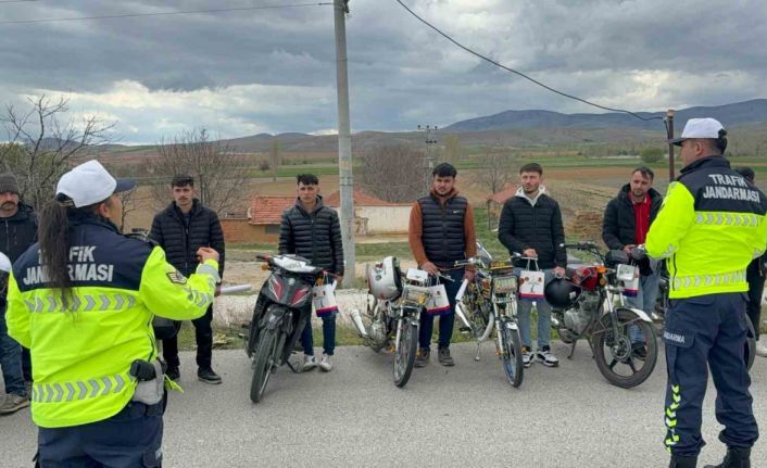 Afyonkarahisar’ın Bolvadin ilçesinde jandarma ekipleri tarafından ‘1 kural bir ömür’ projesi çerçevesinde motosiklet kullanıcılarına eğitim verilip, reflektör ve kask dağıtıldı.