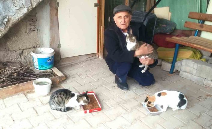 Kütahya’nın Hisarcık ilçesinde emekli gece bekçisi Mustafa Arslan, her gün evinin önünde onlarca sokak kedisini kendi elleriyle besliyor.