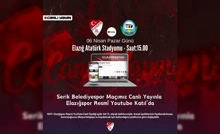 Nesine 2. Lig Kırmızı Grup’un 30. haftasında Elazığspor kritik maçta Serik Belediyespor ile karşılaşacak. Elazığspor Kulübü bu kritik maç öncesi maça gelemeyecek olan taraftarlara müjde verdi. Kulüpten yapılan açıklamada; "Serik Belediyespor karşılaşması Elazığspor Resmi YouTube Katıl’dan canlı yayınlanacaktır" ifadeleri kullanıldı.