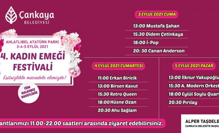 Çankaya Belediyesinin kadınlarla ekonomik dayanışma amaçlı düzenlediği “Kadın Emeği Festivali" bu yıl dördüncü kez Başkentlilerle buluşuyor. Festival 3, 4 ve 5 Eylül’de Ahlatlıbel Atatürk Parkı’nda yapılacak.